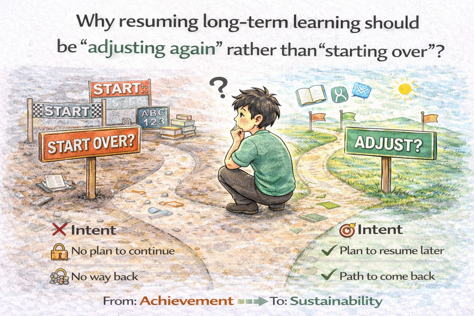 재개를 다시 시작으로 오해하면, 학습자는 쉽게 좌절한다. 예전과 같은 속도가 나오지 않기 때문이다. 반대로 재조정으로 접근하면, 느린 회복은 예상된 과정이 된다. 이 인식 차이가 재개의 성공 여부를 가른다. 장기 학습에서 중요한 것은 빠른 복구가 아니라, 다시 관계를 맺는 것이다.